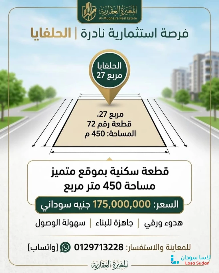 السعر المطلوب: 175,000,000 جنيه سوداني (مائة وخمسة وسبعون مليون جنيه).